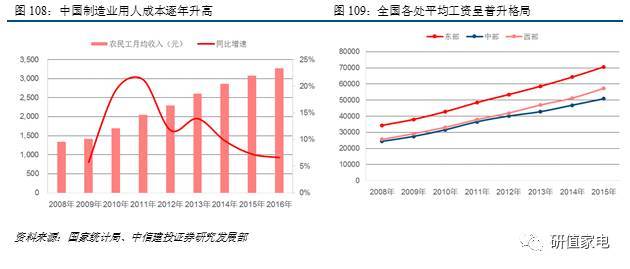 適齡勞動(dòng)力的減少及我國(guó)邊際生產(chǎn)率的提升,在09年后快速推高了工資水平。且無(wú)論是我國(guó)較為發(fā)達(dá)的東部地區(qū),抑或是中西部地區(qū),其人工成本都呈現(xiàn)普升趨勢(shì),傳統(tǒng)制造業(yè)難以通過(guò)位移廠房來(lái)釋放全部人工成本壓力。另外,激烈的競(jìng)爭(zhēng)使得大部分制造企業(yè)難以獲得超額收益,想方設(shè)法降低人工成本為有效出路,中國(guó)發(fā)展方式由勞動(dòng)力密集型向資本技術(shù)密集型轉(zhuǎn)變。