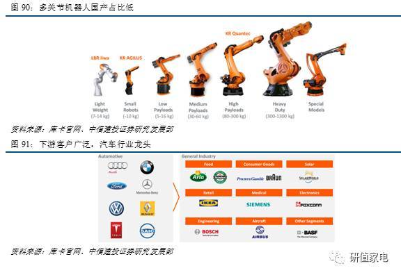 高跨度產(chǎn)品線,庫(kù)卡機(jī)器人產(chǎn)品線幾乎涵蓋所有規(guī)格和負(fù)載范圍的六軸機(jī)器人、卸碼垛機(jī)器人、凈室類(lèi)型、耐高溫防塵機(jī)器人、焊接機(jī)器人、沖壓連線機(jī)器人、架裝式機(jī)器人、高精度機(jī)器人等。豐富的規(guī)格和負(fù)重范圍使庫(kù)卡擁有大量的下游客戶(hù),深耕汽車(chē)和焊接領(lǐng)域使庫(kù)卡成為汽車(chē)自動(dòng)化龍頭。公司在世界范圍內(nèi),汽車(chē)領(lǐng)域占有率第一,一般工業(yè)領(lǐng)域占有率居于前五。