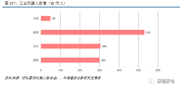 處于自動(dòng)化過(guò)程初期,中國(guó)機(jī)器人行業(yè)仍具備高成長(zhǎng)空間。根據(jù)中國(guó)工程院調(diào)研結(jié)果,近65%企業(yè)有強(qiáng)烈“機(jī)器換人”意愿,另有14.5%的企業(yè)正在做機(jī)器換人準(zhǔn)備。從滲透率來(lái)看,我國(guó)2015年工業(yè)機(jī)器人密度達(dá)49臺(tái)/萬(wàn)人,對(duì)標(biāo)國(guó)際,主要工業(yè)國(guó)德國(guó)、日本達(dá)到約300臺(tái)/萬(wàn)人,韓國(guó)更高達(dá)531臺(tái)/萬(wàn)人,國(guó)內(nèi)工業(yè)機(jī)器人密度有數(shù)倍成長(zhǎng)空間。