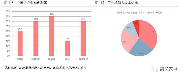 工業(yè)機(jī)器人的核心零部件主要是指控制器、伺服電機(jī)和精密減速器,它們占到工業(yè)機(jī)器人成本的70%左右。在機(jī)器人產(chǎn)業(yè)鏈中,上游的核心零部件在很大程度上決定了機(jī)器人的性能,具備最高的技術(shù)難度,享有最高的毛利率,外資壟斷嚴(yán)重。同時(shí)由于關(guān)鍵零部件成本占比高,嚴(yán)重侵蝕了中游本體制造商的利潤(rùn)水平。