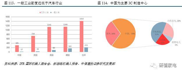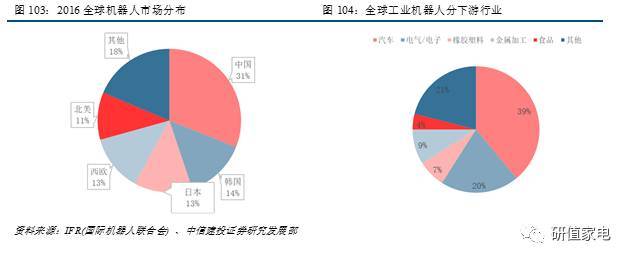 分行業(yè)來(lái)看,汽車(chē)行業(yè)制造過(guò)程涉及大量的點(diǎn)焊、弧焊、噴涂、搬運(yùn)等工序,適合自動(dòng)化應(yīng)用,為工業(yè)機(jī)器人應(yīng)用的傳統(tǒng)領(lǐng)域。汽車(chē)及電子電器應(yīng)用占比合計(jì)約達(dá)60%。