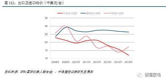 與德國(guó)相比,日本出口均價(jià)的大幅下滑,主要因?yàn)槿毡緭碛凶畲蟮臋C(jī)器人產(chǎn)能,是全球唯一的機(jī)器人凈出口國(guó),且其產(chǎn)品的34%銷(xiāo)往中國(guó)市場(chǎng),2015-2016年,中國(guó)銷(xiāo)量60%為技術(shù)相對(duì)簡(jiǎn)單的直角坐標(biāo)機(jī)器人。
