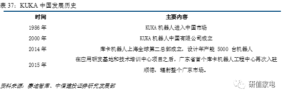 在國(guó)外工業(yè)機(jī)器人行業(yè)日趨成熟背景下,KUKA作為汽車(chē)行業(yè)領(lǐng)導(dǎo)者,當(dāng)下的兩個(gè)戰(zhàn)略方向,一個(gè)是大力拓展中國(guó)市場(chǎng),另一個(gè)就是拓展汽車(chē)行業(yè)外的一般工業(yè)。