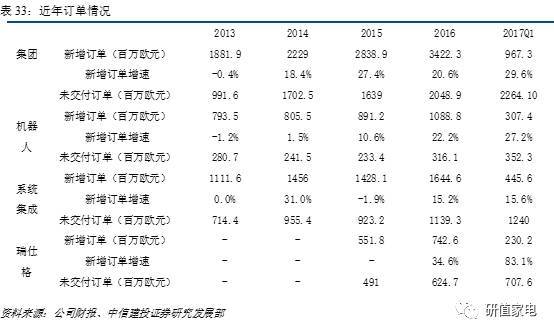 2017年一季度KUKA實(shí)現(xiàn)營(yíng)業(yè)收入7.9億歐元,同比增加25.7%;凈利潤(rùn)0.26億歐元,同比增加27.3%。新增訂單延續(xù)高增長(zhǎng)態(tài)勢(shì),新增訂單9.7億歐元,同比增長(zhǎng)29.6%。