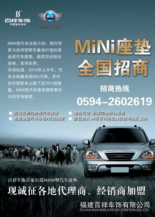 據(jù)了解,百祥車飾在此次訂貨會隆重推出的“MINI型汽車涼墊”,是全國首家專為經(jīng)濟型轎車量身打造的高品質汽車座墊,價位適中,版型安全貼合座椅,美觀實用。