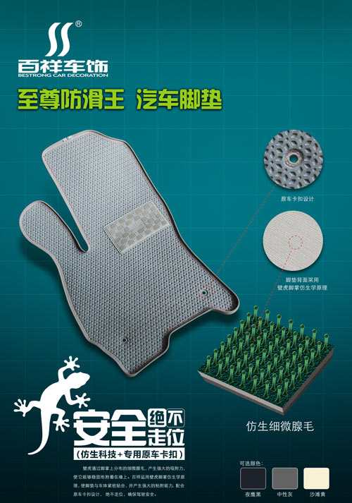 另外,在此次百祥發(fā)布的新品中,1.5代“至尊防滑王”腳墊同樣引起了廣泛關注。腳墊產(chǎn)品的安全問題,一直困擾著各大廠家。百祥針對這一問題,運用“壁虎仿生科技”,推出“至尊防滑王”腳墊。該產(chǎn)品系列具備多種特點:第一,產(chǎn)品底面采用模仿壁虎掌紋仿生學的拉絲處理技術,讓腳墊可牢固地“黏”在車底,再配上卡扣處理,確保行車安全;第二,開發(fā)專車專用版型,與車型100%契合,確保產(chǎn)品不走位;第三,產(chǎn)品后排座采用分體連接技術,使腳墊完全貼服車型,即美觀又安全使用。