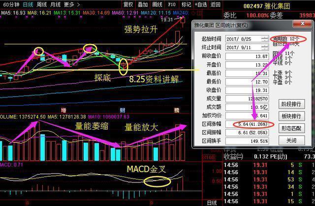 雅化集團002497選股理由:該股前期經(jīng)過一小波拉升以后,回踩下來,當回踩至主力成本線的時候,主力資金開始進場,經(jīng)過短期的橫盤調(diào)整,在25號當天,本人發(fā)現(xiàn)主力洗籌完畢,企穩(wěn)信號已經(jīng)出現(xiàn),macd也形成了金叉,果斷在專欄中運用一分鐘選股法選出并講解該股,自講解完之后,短短的12個周期,也是達到了41%的收益,如果你沒抓住這波收益,那么你肯定不是本人的粉絲朋友了!想抓住這波收益的朋友,及時關(guān)注本人的專欄!想學習選強勢股和買賣點操作技巧的朋友可以聯(lián)系晴天,晴天會給大家一一解答。扣#扣~號:1101626176!薇#信/號/:【qt8656)本周同樣會通過一分鐘選股法選出在底部啟動的短線利好個股,給晴天專欄的股友參考學習,很多晴天專欄的股友也是經(jīng)常抓到的大漲的股票,對這種選股法有興趣的朋友都可以到晴天的專欄中來查閱!
