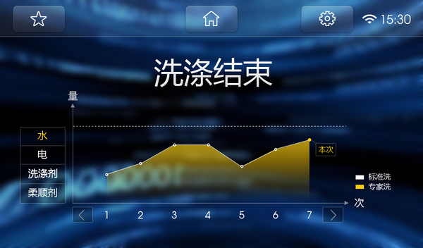 比佛利滾筒洗衣機(jī)支持智能識(shí)別衣物材質(zhì)、重量,自動(dòng)計(jì)算合理用水量、用電量;智能感知洗滌環(huán)境,依托全國(guó)區(qū)域水質(zhì)狀況大數(shù)據(jù),因地制宜為每件衣服提供專(zhuān)屬的定制洗滌方案。在洗衣專(zhuān)家結(jié)束后,其搭配的7英寸TFT彩屏觸控板會(huì)出現(xiàn)相應(yīng)使用量的K線(xiàn)圖,用戶(hù)可以看出7次使用內(nèi)的走勢(shì)圖,并與標(biāo)準(zhǔn)量進(jìn)行比對(duì)。