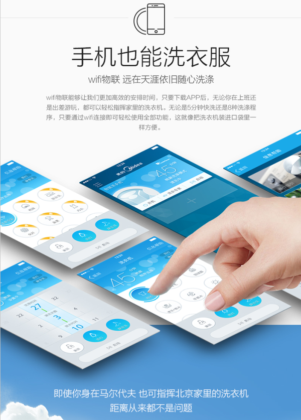 作為一款多功能智能洗衣機(jī),比佛利滾筒洗衣機(jī)也支持手機(jī)操控。下載好APP連接好WiFi后,無(wú)論是在上班還是出差游玩,都可以輕松指揮家中洗衣機(jī)。無(wú)論是五分鐘快洗還是八種洗滌程序,都可以用手機(jī)隨意操控,就像把洗衣機(jī)裝進(jìn)口袋一樣方便。