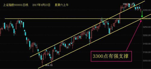 前天,即2017年9月22日,上周星期五,上證指數(shù)只差一顆兒米就把缺口給補(bǔ)上了。下周,是國(guó)慶前的最后一周交易,大盤會(huì)怎么走呢?估計(jì):前半周下跌補(bǔ)缺,指數(shù)有可能回落到3300點(diǎn),這個(gè)地方具有強(qiáng)支撐;后半周企穩(wěn)震蕩,周五小幅收紅盤迎國(guó)慶。因?yàn)榕R近節(jié)假日,資金考慮到各種不確定的因素很多,一般都比較謹(jǐn)慎,甚至還有不少的資金會(huì)選擇持幣過(guò)節(jié)。當(dāng)然,下周就直接進(jìn)行拉升向上走的可能性并不是沒有,但這種可能性的概率不是很大。