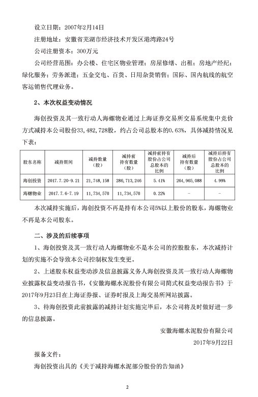 及其一致行動(dòng)人海螺物業(yè)以集中競(jìng)價(jià)方式減持公司股份33,482,728股,約占公司總股本的0.63%。
