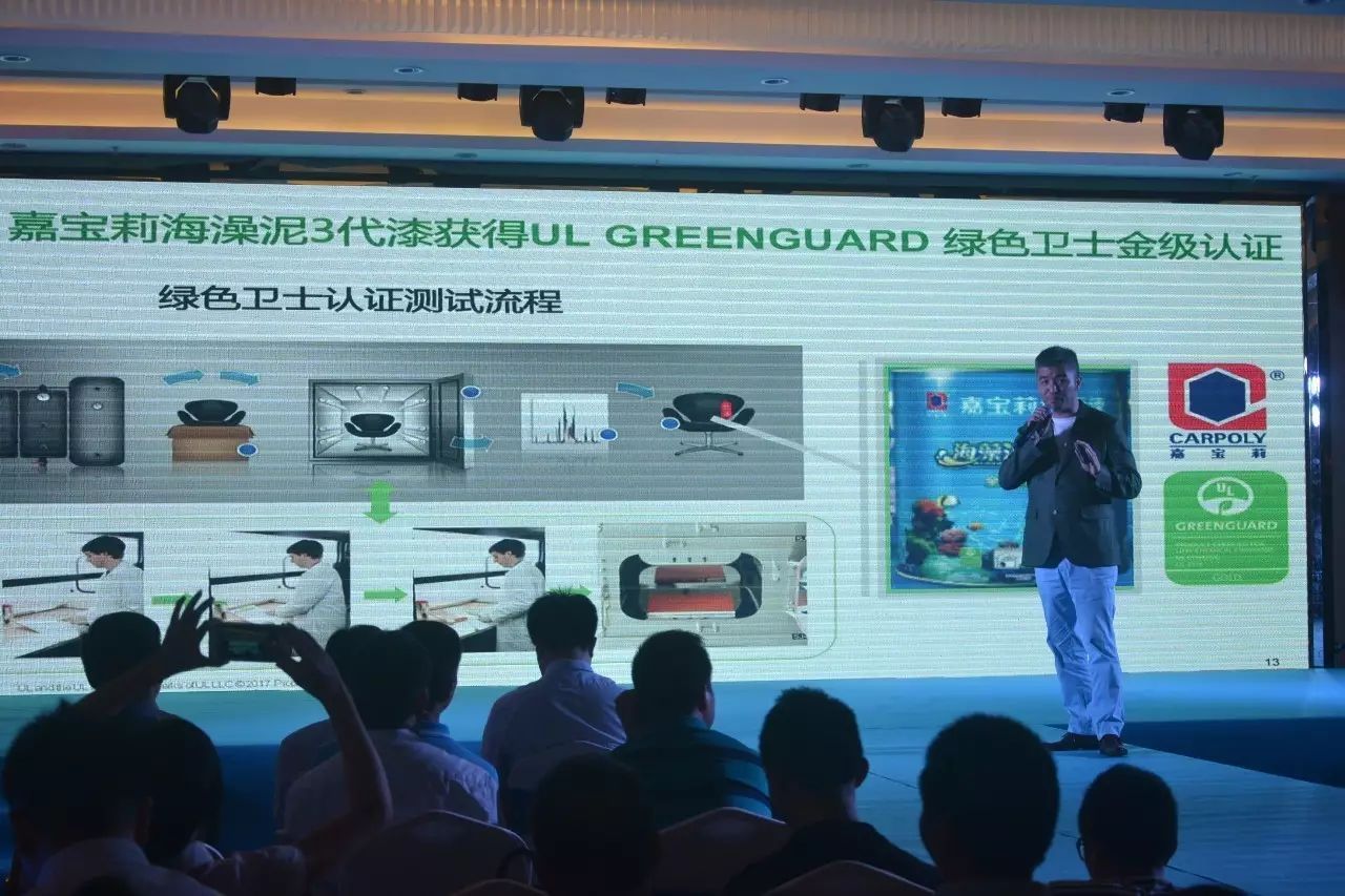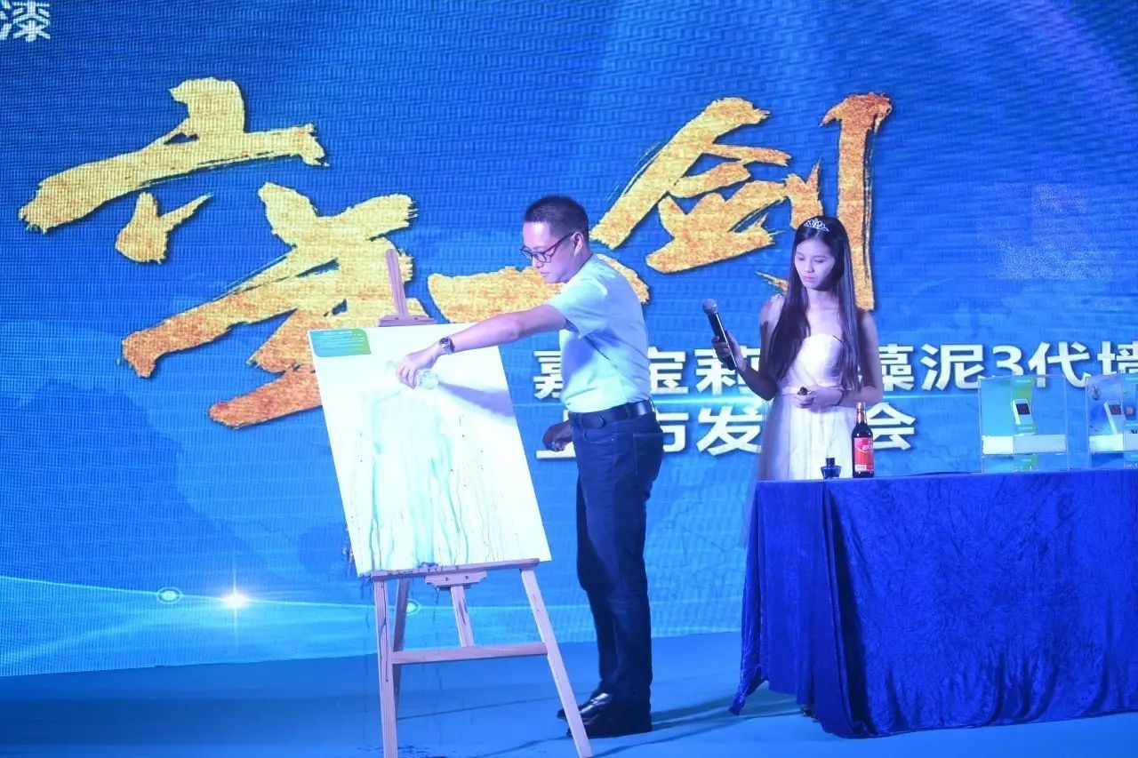 本次發(fā)布會以深海藍為主調(diào),與海藻泥的主題相映成趣。會議現(xiàn)場,隨著主持人倒計時,海藻泥3代正式啟動上市。本次發(fā)布會的主角——海藻泥3代,伴隨著青春靚麗的模特走秀,在短短幾分鐘內(nèi)讓臺下觀眾盡睹產(chǎn)品風(fēng)采。嘉寶莉工程師就海藻泥3代產(chǎn)品的發(fā)展歷程、上市背景和產(chǎn)品功能、涂裝效果進行了介紹和現(xiàn)場體驗演示。海藻泥3代的面市,一是付出了更多的攻關(guān)研發(fā)和努力;二是榮獲了兩項權(quán)威的國際空氣質(zhì)量認證——美國GREENGUARD綠色衛(wèi)士金級認證和法國室內(nèi)環(huán)境檢測A+認證;三是海藻泥3代除了有一般海藻泥的傳統(tǒng)功能外,更具I級抗污功能和優(yōu)越的抗甲醛與抗污功能。