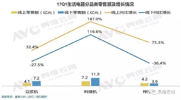 進(jìn)入初夏,氣溫回暖,但是小家電市場依舊寒冷如冬,根據(jù)奧維云網(wǎng)(AVC)推總數(shù)據(jù)顯示,2017年第一季度小家電線上市場零售額同比增長56.1%,而線下市場零售額持續(xù)下降,同比下降9.7%。然而,在這寒冷的背后,也有些許暖意。