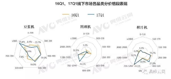 再從價(jià)格來看,受結(jié)構(gòu)改善的影響,一季度豆?jié){機(jī)和料理機(jī)的高價(jià)位零售額份額上漲較明顯,高價(jià)位豆?jié){機(jī)零售額份額的主要貢獻(xiàn)來自于破壁豆?jié){機(jī),根據(jù)奧維云網(wǎng)(AVC)監(jiān)測數(shù)據(jù)顯示,2017年第一季度,破壁豆?jié){機(jī)零售額份額已突破20%,使豆?jié){機(jī)技術(shù)創(chuàng)新再上一個臺階。