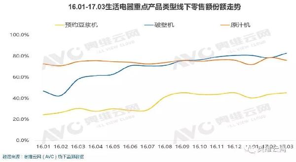 小家電的技術(shù)創(chuàng)新從未停止,一季度線下市場預(yù)約豆?jié){機(jī)、破壁機(jī)、原汁機(jī)等技術(shù)創(chuàng)新產(chǎn)品零售額份額雖有跌落,但依然有上升的趨勢,根據(jù)奧維云網(wǎng)(AVC)監(jiān)測數(shù)據(jù)顯示,破壁機(jī)和原汁機(jī)零售額份額已超過70%,而預(yù)約豆?jié){機(jī)雖未達(dá)到普及,但零售額份額也超過40%,未來市場存在巨大的空間。