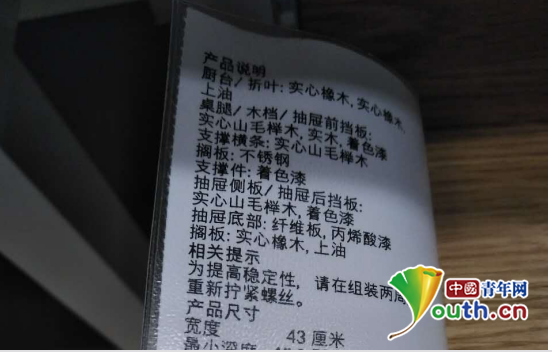 今年7月,中國青年網記者在武漢宜家隨機購買了一款“斯坦托”廚房推車,其外包裝上標注的生產者及地址為“宜家瑞典有限公司”,產地標注為“羅馬尼亞”,執行標準為Q31/0115000148C001-2015-01,貨品編號為“20201917/20090”。在標價為999元的價格簽上,醒目地注明:橡木。
