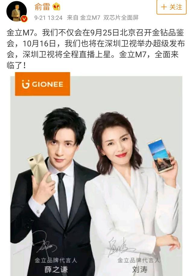 在薛之謙重重受挫只時(shí),金立此舉可謂是雪中送炭了,其實(shí)一個(gè)廠商在請(qǐng)代言人方面是非常慎重的,其實(shí)薛之謙這個(gè)代言人是非常盡職盡責(zé)的,每次微博發(fā)的后面都是金立手機(jī)的“小尾巴”,算是打足了廣告。同時(shí)還確定薛之謙將會(huì)出席10月16日的新品發(fā)布會(huì)。