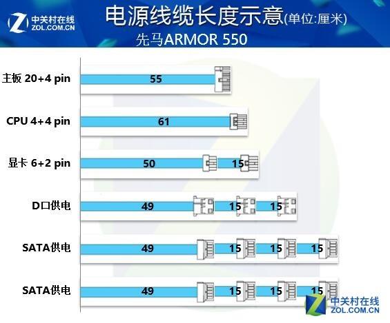 先馬ARMOR\u00A0550W電源線纜長度示意