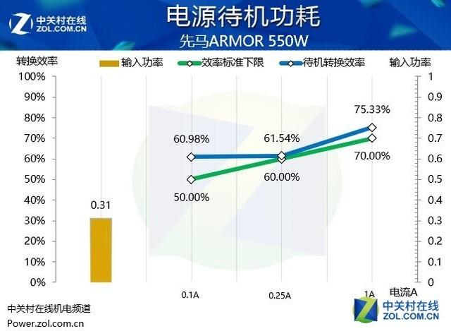 在輸出輸入功耗比和功率因數(shù)測試中,這款電源也有很好的表現(xiàn)。得益于主動式PFC設計,電源有更好的功率因數(shù)表現(xiàn),低至0.31W的待機功率也可以為用戶提供穩(wěn)定節(jié)能的用電支持。