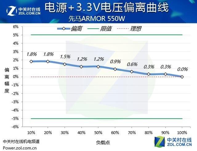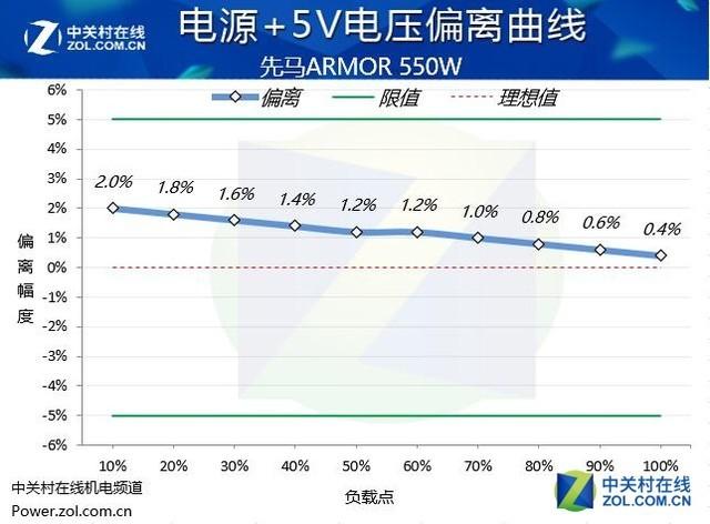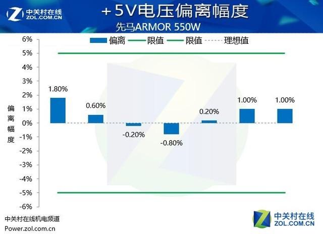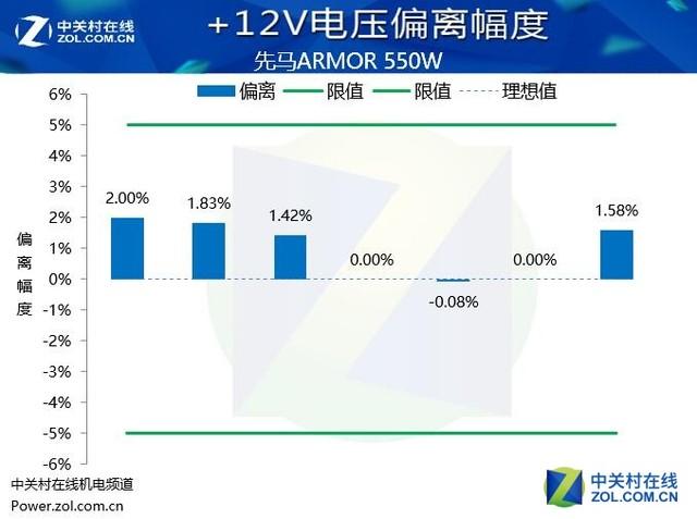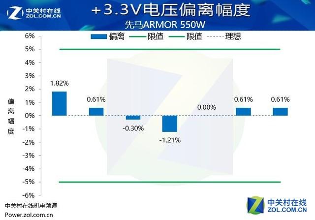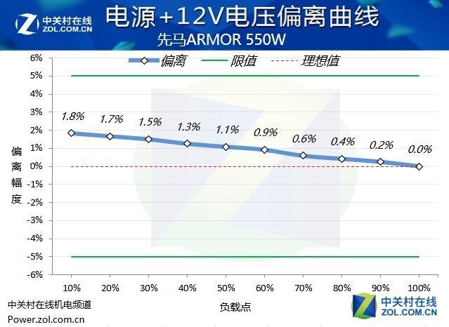 從實際的測試表現(xiàn)來看,先馬ARMOR\u00A0550W電源的電壓偏離控制處于出色的水平,+12V,+5V和+3.3V的電壓偏離都控制在2%的偏離幅度內(nèi),這樣的表現(xiàn)值得表揚。