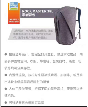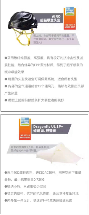 近年來(lái)KAILAS凱樂(lè)石,以“輕量化革命先鋒”為己任,頻頻在新品研發(fā)上發(fā)力,此次獲獎(jiǎng)的三件專業(yè)產(chǎn)品都受到評(píng)委會(huì)的高度認(rèn)可和評(píng)價(jià)。KAILAS Dragonfly UL 1P+蜻蜓UL野營(yíng)帳專為狂熱的戶外愛(ài)好者的雙人出行而設(shè)計(jì),采用目前世界上最為輕質(zhì)的10D材料與最為輕量的進(jìn)口DAC羽量級(jí)NFL帳桿,構(gòu)成整頂帳篷的主體,其收納體積小巧,只占用極少的空間,整重只有950g,達(dá)到雙人帳中最佳的空間重量比。內(nèi)外帳一體設(shè)計(jì)、快速穿桿組成快速搭建系統(tǒng),得益于隧道帳穩(wěn)定的結(jié)構(gòu),優(yōu)異的抗風(fēng)性能,適用于野外各種復(fù)雜環(huán)境。KAILAS Airo超輕攀登頭盔是一款全新一體EPP發(fā)泡材料成型符合亞洲人頭圍需求的超輕量頭盔,碳纖維頂蓋具有極好抗沖擊性和減震性能,滿足攀登者對(duì)于安全和重量的極致追求。KAILASRock Master 38L攀巖背包針對(duì)攀巖者設(shè)計(jì)的功能強(qiáng)大專業(yè)款攀巖背包,亦適用于都市休閑各種運(yùn)動(dòng)出行,內(nèi)置保溫袋和外置頭盔收納在細(xì)節(jié)處彰顯專業(yè)。