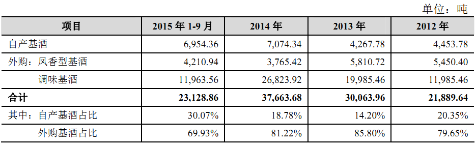 據(jù)招股書顯示,2012年-2014年及2015年1-9月,西鳳酒外購基酒數(shù)量分別為1.20億噸、2.58億噸、3.06億噸和1.62億噸,占當期西鳳酒基酒總需求量的比分別為79.65%、85.80%、81.22%和69.93%。
