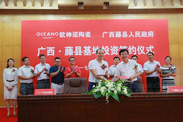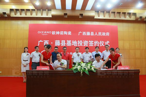 \u00A0 \u00A0 中國陶瓷網(wǎng)訊 9月22日上午,佛山歐神諾陶瓷股份有限公司廣西·藤縣生產(chǎn)基地投資簽約儀式在廣西藤縣人民政府第二會(huì)議室隆重舉行。