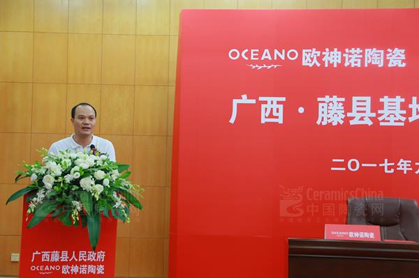 \u00A0 \u00A0 會(huì)上,藤縣縣長覃仕平首先發(fā)表了致辭:“佛山歐神諾陶瓷股份有限公司落戶藤縣,是我縣招商引資的一件大事,也是我縣陶瓷園區(qū)產(chǎn)業(yè)發(fā)展的一件喜事!”。他表示,藤縣縣委、縣政府將會(huì)一如既往地重視和支持企業(yè)的建設(shè)發(fā)展。