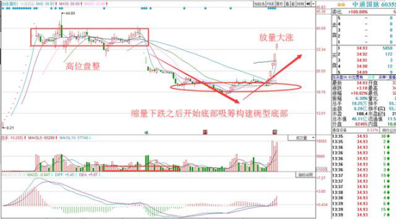 中通國脈新股開板之后散戶正常賣出主力開始接過籌碼并且高位盤整洗盤,不過因為利空消息導(dǎo)致股價直接3個跌停導(dǎo)致主力損失慘重可是緩慢出貨,查看龍虎榜發(fā)現(xiàn)底部區(qū)間不斷用新主力縮量吸籌隨著碗型底部構(gòu)成并且有5G規(guī)劃利好消息推動,主力開始連續(xù)放量拉升股價。我也是發(fā)現(xiàn)一只主力操作手法和中通國脈一樣但是還在低位啟動初期的個股,K線如下。