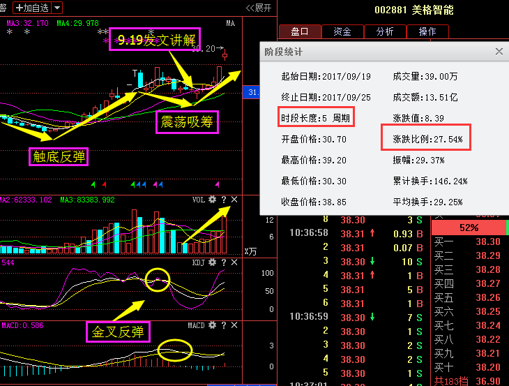 美格智能002881選股理由:大家可以看到這只票的走勢,前期沖高回落后下探之后觸底反彈,隨后陷入震蕩吸籌的狀態(tài),本人在9月19日發(fā)現(xiàn)了此股的減倉良機(jī),發(fā)文時(shí)下方的量能開始放量說明資金開始入場,下方的KDJ,MACD指標(biāo)呈現(xiàn)金叉買入的信號截止目前短短的5個(gè)周期的時(shí)間也是收獲了27.54%,那么試想一下,如果你在當(dāng)時(shí)就關(guān)注了筆者的微信,是不是也可以輕輕松松的抓住這波收益呢?想學(xué)習(xí)選強(qiáng)勢股和買賣點(diǎn)操作技巧的朋友可以聯(lián)系若雪,添加若雪微信【ruoxue48】,QQ【447697430】,放心,都是不收費(fèi)的。