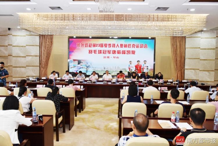 歡迎儀式上,坪山區民政局局長曹慶新與深圳市殘聯組宣部董飛主任分別向唐楷峰贈送人才安居房的鑰匙及專業羽毛球拍,唐楷峰回贈1件第23屆夏季聽障奧林匹克運動會中國代表隊參賽球衣作為紀念。