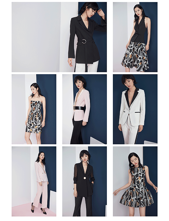 E+F新式西裝,帶著一絲浪漫與優雅的中性風。一方面以男士西服為靈感,從工藝、圖案、配件等,都或多或少融入了男性西服的元素,讓西裝的帥氣不減;另一方面,通過輕薄的面料、貼身的剪裁、大膽的用色,加之部分絲綢、蕾絲材質的拼接設計,充分體現高雅、性感的女性魅力。