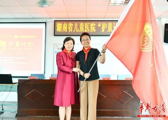 省衛(wèi)計(jì)委副主任易露茜(左)向省兒童醫(yī)院院長姚旭(右)授旗。
