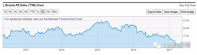 一、昔日“村姑”,今日 “麗人” 鄭爸爸20歲的時候,還是沃爾瑪?shù)男”0病:髞磙D(zhuǎn)崗銷售,書店、餐飲都一一涉及,之后才確定做“女性內(nèi)衣”,1998年創(chuàng)立“都市麗人”。“麗人”一開始還無人知曉,但是鄭爸爸極富商業(yè)頭腦,讓“麗人”走群眾路線,靠高性價比迅速扎根二三線城市。 2003年非典,人心惶惶,哪有人做生意呀!鄭爸爸在這個時候去抄底店面,公司店面迅速擴張。 2009年金融危機期間,鄭爸爸再以顯現(xiàn)「逆勢抄底」的膽量,以半價購置廠房、且并購數(shù)家企業(yè)。這一年,都市麗人將總部遷往東莞,開始向全國擴張。加上資本進入,公司開始每年保持30%以上增長,門店數(shù)量從2003年的近50家到2014年的6272家門店,深入三四線城市。把農(nóng)村包圍城市實踐得如此之好,看來,鄭爸爸就是毛主席的粉絲。 2014年6月“麗人”于香港上市,市值一度升至最高達170億港元,市盈率近30倍市盈率,比起擁有維多利亞的秘密上市公司L Brands的市盈率還要高。下面為L Brands過往5年的市盈率走勢圖,最高峰時為27倍。