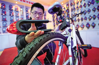通用鎖具研發(fā)的新型發(fā)光自行車鎖還可以當(dāng)作尾燈,提高了騎車的安全系數(shù),在市場上頗受歡迎。劉偉攝