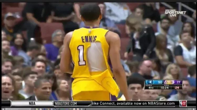 在今天進行的季前賽里,湖人隊對陣森林狼隊,湖人隊后衛恩尼斯的球衣居然被對手不小心撕下了一大塊,只能尷尬地回去替補席換球衣。