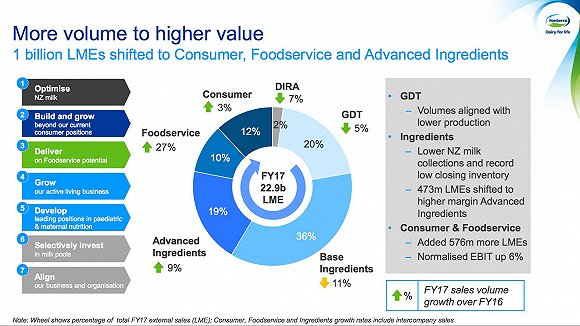 2017財年業(yè)績顯示,恒天然的高端乳品原料的銷量增加了9%。這個品類包括功能性乳蛋白、高規(guī)格全脂奶粉、超強拉絲馬蘇里拉奶酪等,這些高端乳品原料占據(jù)了恒天然整個外部銷量的19%。