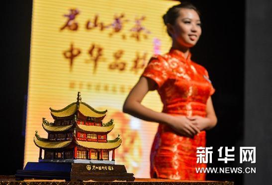 拍賣的君山銀針金鑲玉外包裝為岳陽(yáng)樓造型(10月31日攝)。新華網(wǎng)圖片 白禹 攝