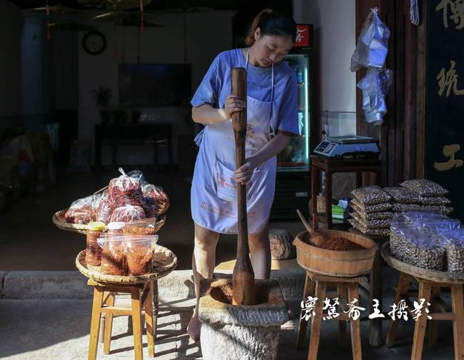 堯壩古鎮(zhèn)賣(mài)辣椒的“辣妹子”,每天都用這古老的石窩把辣椒舂成粉