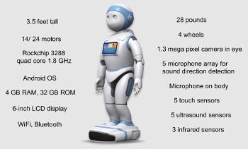 機器人包括5x觸摸傳感器、用于短距離物體檢測的3x紅外傳感器以及用于遠距離檢測的5x超聲波傳感器。雖然沒有面部表情,但有可以對其進行編程的LED。