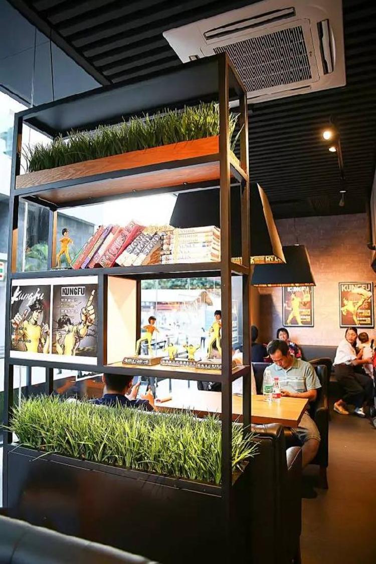 這些體驗店和你所習(xí)慣的那些真功夫看起來完全不同,店內(nèi)顏色以黃色、黑色、原木色為主,木質(zhì)座椅被替換成了沙發(fā),店里擺著書架、植物,新店的 logo 底色由紅色改成黑色,原本看起來很像李小龍的人物被虛化。