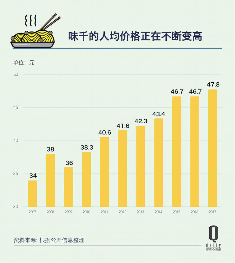 按照味千的財報,他們在內(nèi)地的門店人均消費額從 2007 年的 34 元增加到今年的 47.8 元。