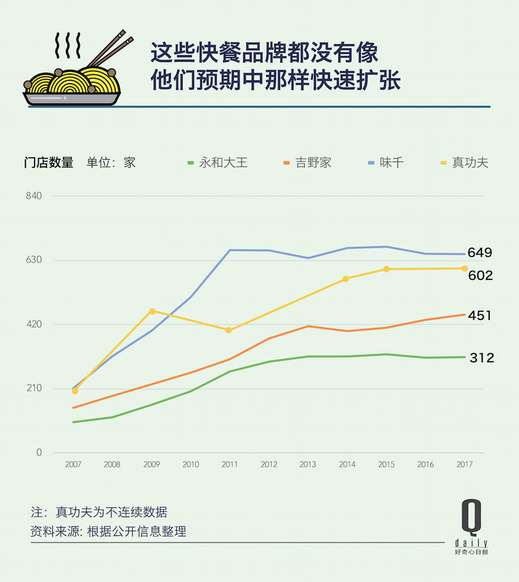 而 2007 年徹底收購永和大王的菲律賓餐飲集團(tuán)快樂蜂(Jollibee)為永和所做的規(guī)劃是,2017 年門店數(shù)量達(dá)到 1000 家。但永和大王的門店擴(kuò)張在 2013 年左右就逐漸停滯了,目前只有 312 家店。