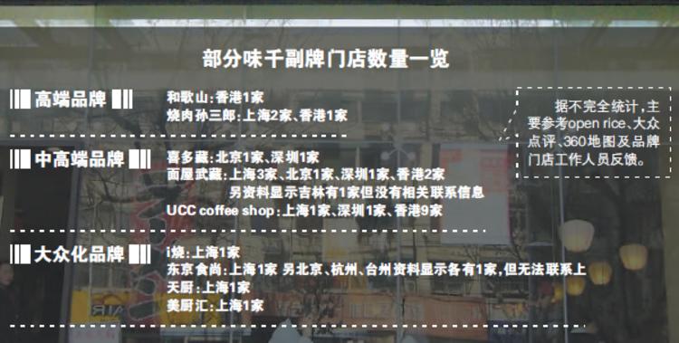 味千旗下的副牌并不都做得很成功!侗本┥虉蟆吩谌ツ 5 月的報道中對味千的副牌進(jìn)行了簡單的統(tǒng)計,在一年多后的現(xiàn)在,香港的 1 家和歌山和 1 家燒肉孫三郎都已經(jīng)關(guān)門了。