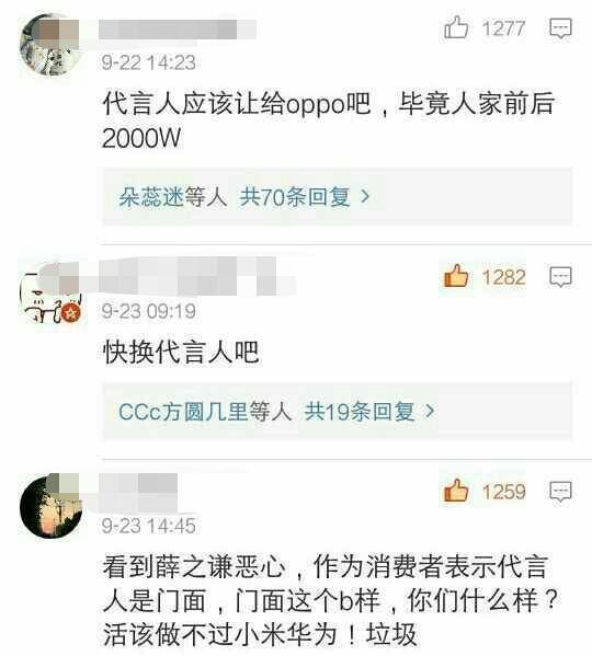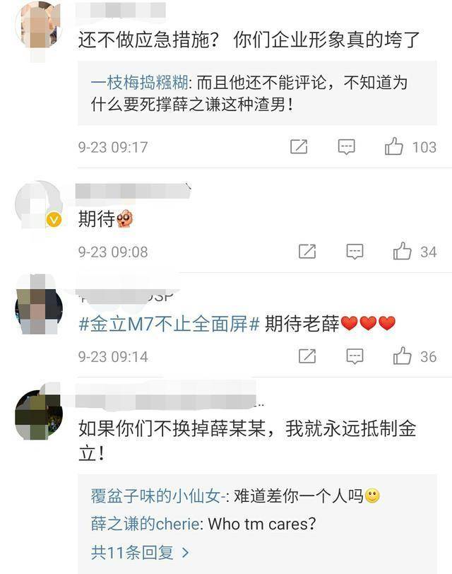 目前,薛之謙代言的其他產(chǎn)品,如金立手機、飄柔等暫未對這件事進行表態(tài)。網(wǎng)友們可閑不住,紛紛在這些官方微博下留言。最明顯的就是金立官方微博了,無論是在官博下還是副總裁俞雷微博下方,都有大批網(wǎng)友希望換掉品牌代言人。請愿的同時,還不往調(diào)侃其他手機廠商。