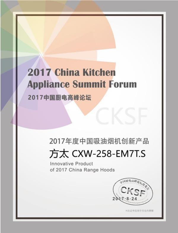 方太智能油煙機(jī)EM7T.S榮獲“2017年度中國(guó)吸油煙機(jī)創(chuàng)新產(chǎn)品”獎(jiǎng)
