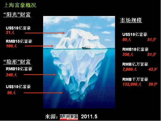 目前大約有350位十億富豪駐上海,其中109人是登上《2010胡潤百富榜》的“陽光富豪”,其余大約240人為隱形富豪,比陽光富豪多出一倍多。而全國十億富豪目前大約有4000人,其中1363人為陽光富豪。對比全國其他城市,上海陽光富豪人數(shù)居全國第二,北京以124人居全國第一。