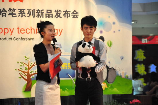 現(xiàn)場(chǎng)主持人與小朋友互動(dòng),介紹哈筆熊的功能特點(diǎn)