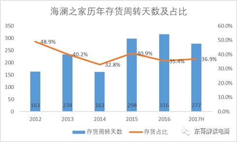 這種模式導(dǎo)致海瀾之家的存貨占比非常高,我們整理了海瀾之家上市以后的存貨周轉(zhuǎn)和占比,可以看出在大部分時間,其存貨占比始終在35%以上,有時甚至超過40%。