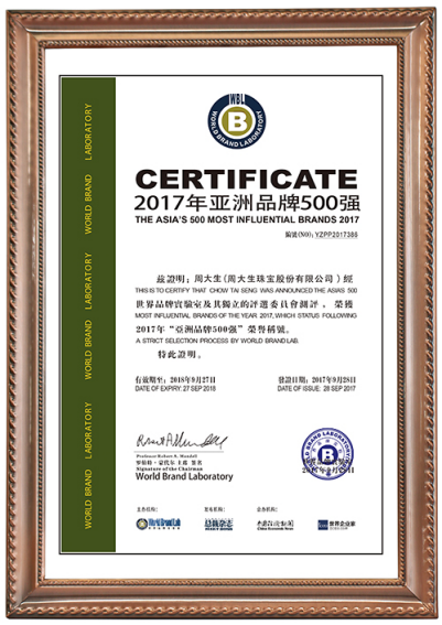 9月28日,2017年《亞洲品牌500強(qiáng)》排行榜在香港揭曉,周大生榮獲由世界品牌實(shí)驗(yàn)室與世界經(jīng)理人集團(tuán)共同頒發(fā)的“亞洲品牌500強(qiáng)”榮獲證書。這是周大生連續(xù)第5年上榜,位列排行榜第386位。